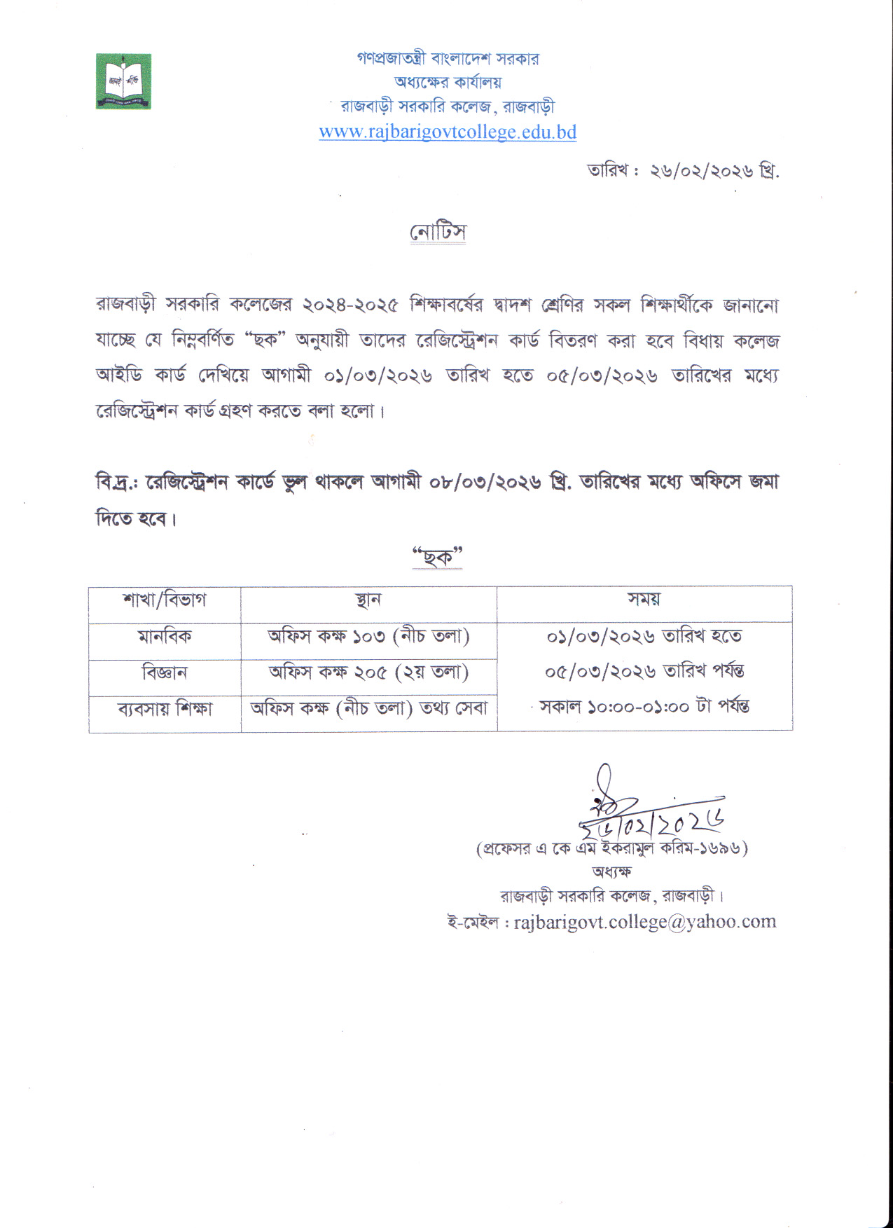 | 7 | দ্বাদশ শ্রেণির রেজিস্ট্রেশন কার্ডে বিতরণ-এর নোটিস | 2026-02-26 |