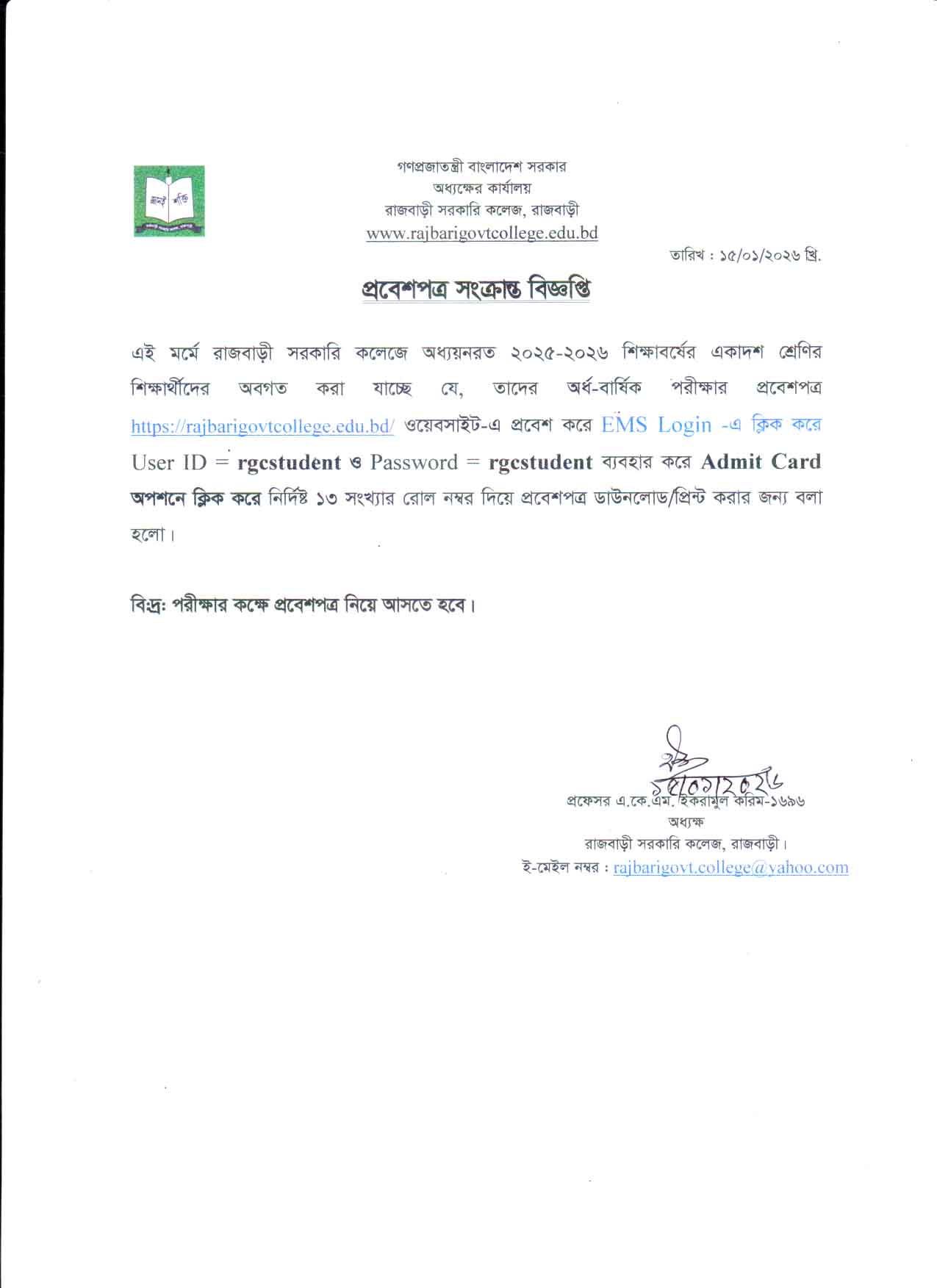 একাদশ শ্রেণির অর্ধ-বার্ষিক পরীক্ষা প্রবেশপত্র সংক্রান্ত বিজ্ঞপ্তি |