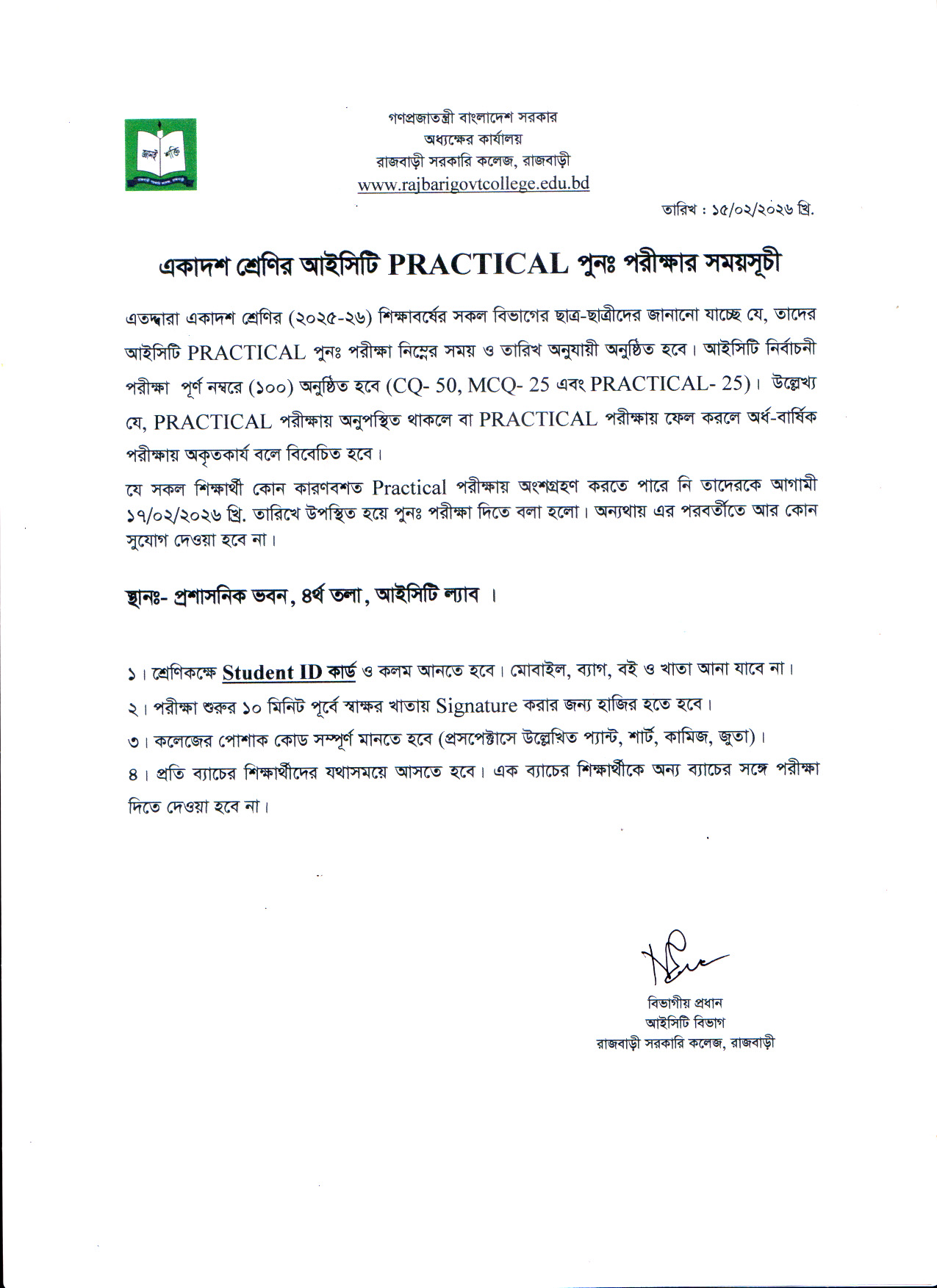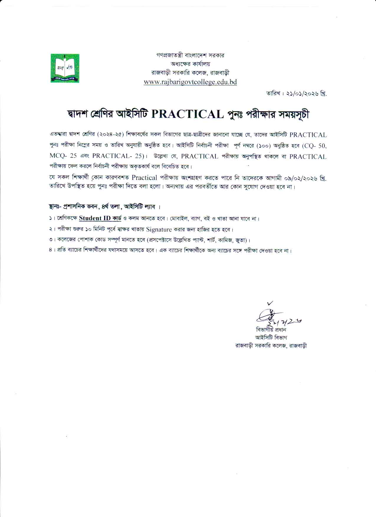 একদাশ শ্রেণির আইসিটি PRACTIAL পুন: পরীক্ষার সময়সূচী |