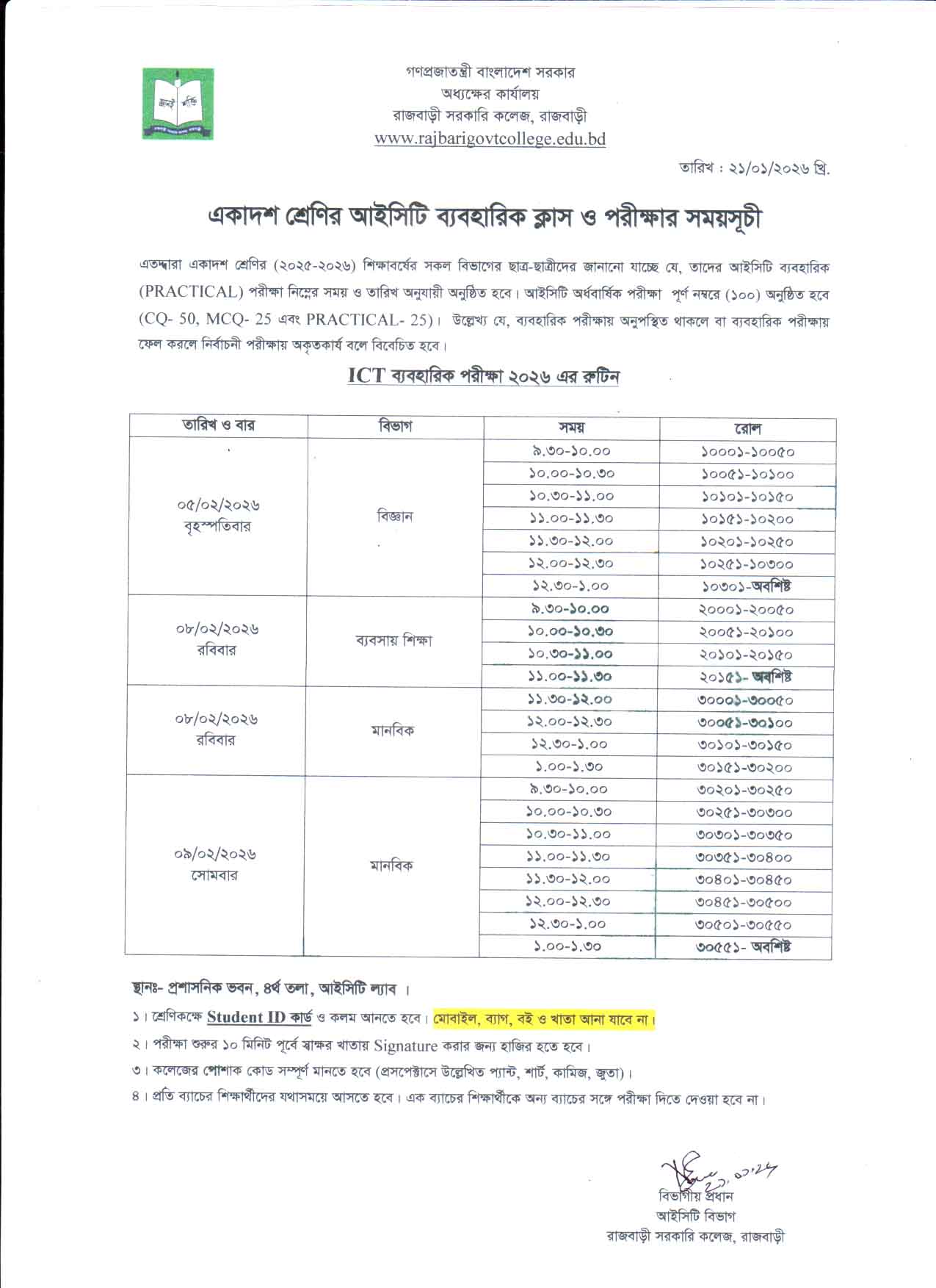 একাদশ শ্রেণির আইসিটি ব্যবহারি ক্লাস ও পরীক্ষার সময়-সূচি |