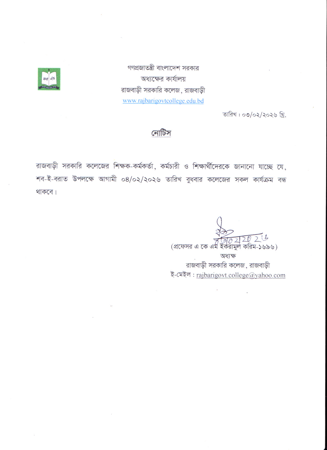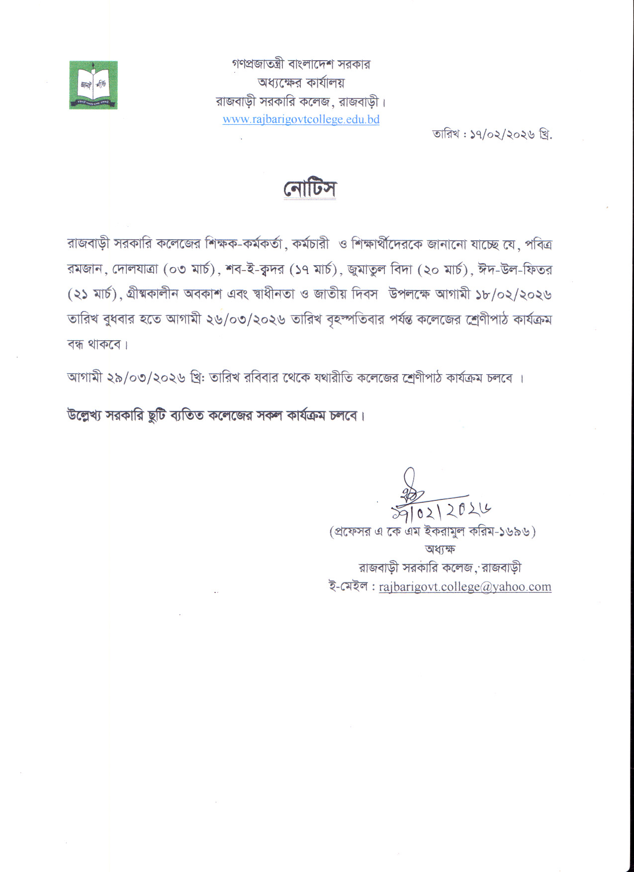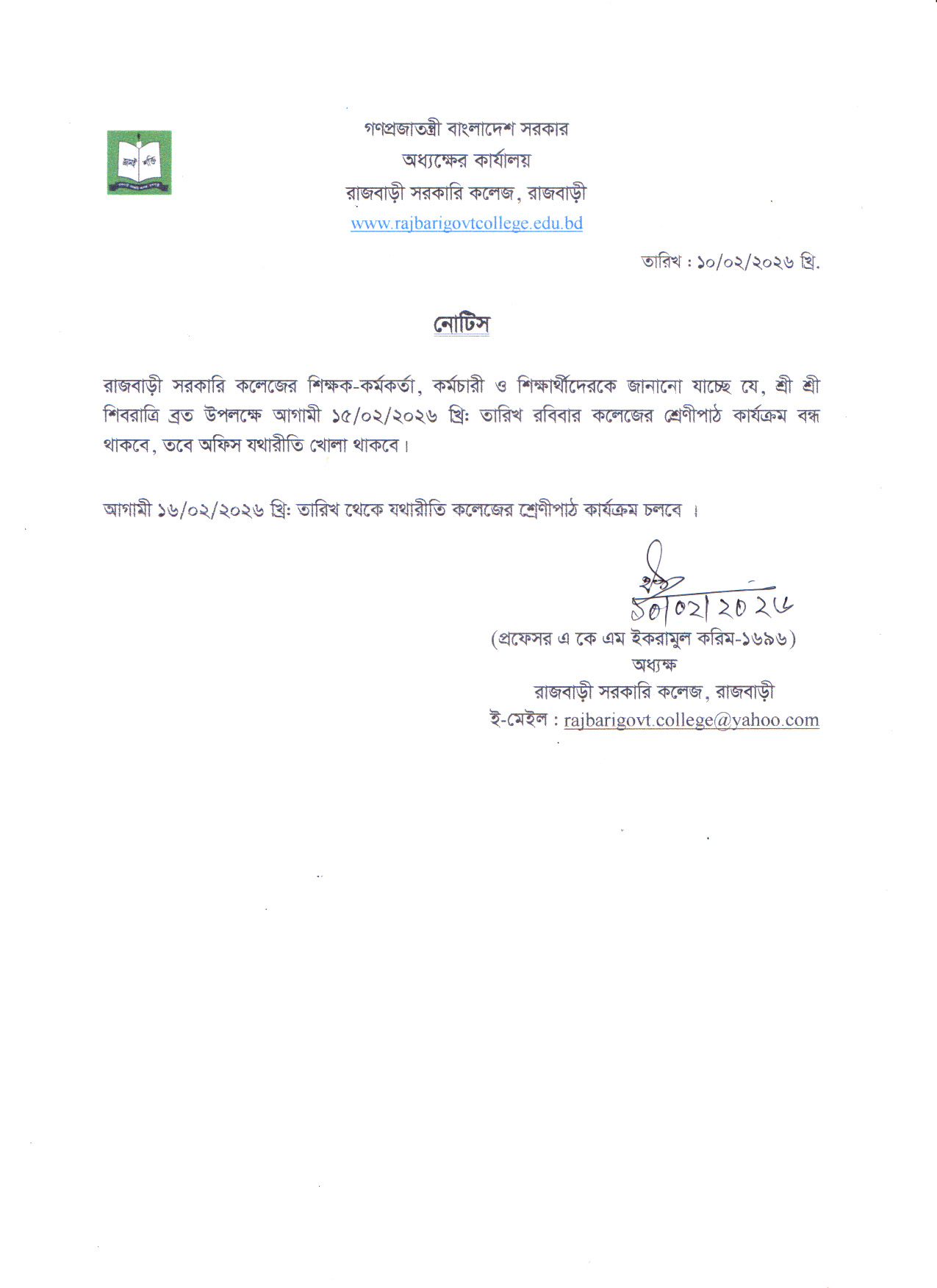 শ্রেণীপাঠ কার্যক্রম বন্ধের নোটিস |
